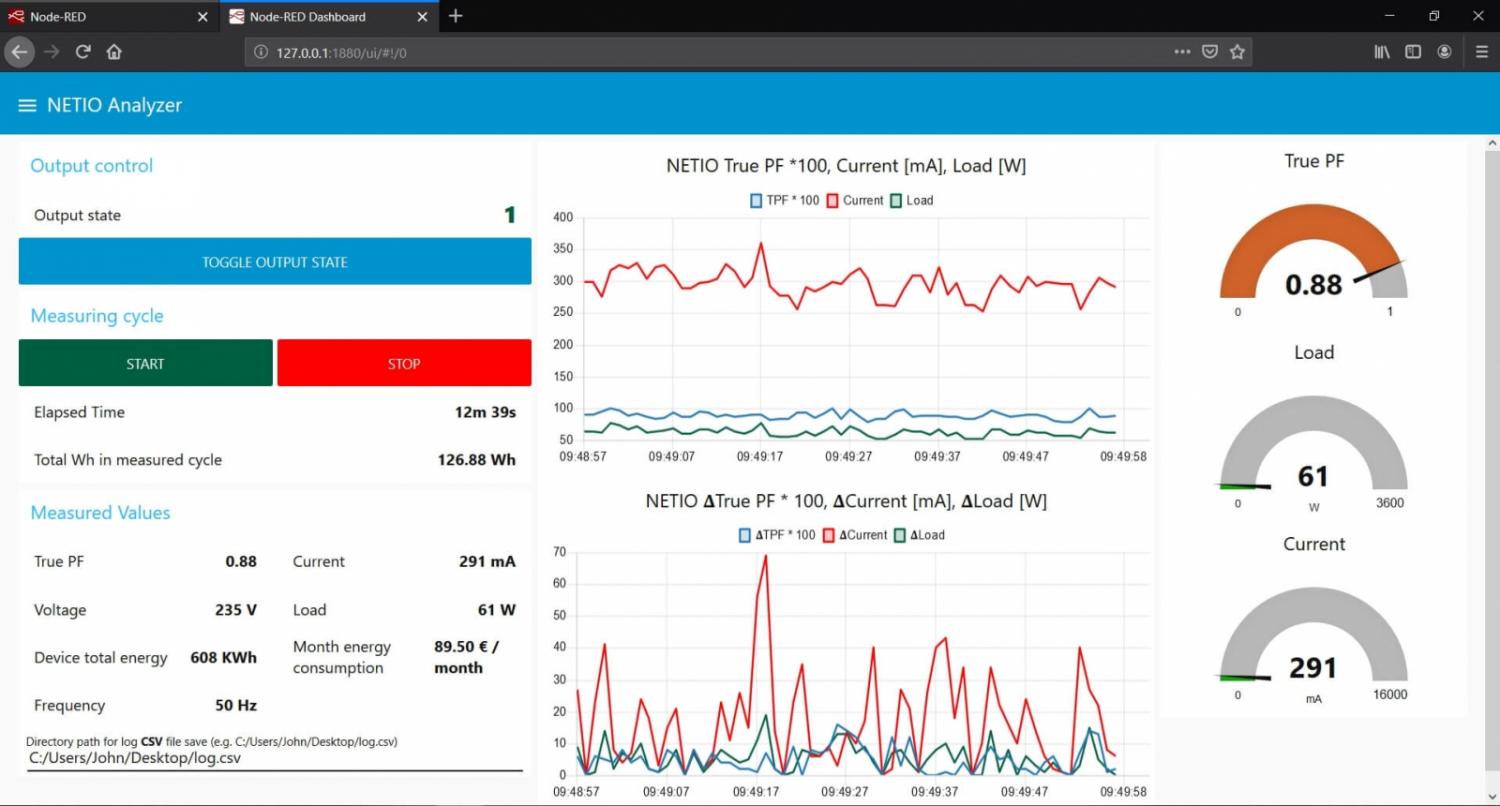 Med NETIO Power Analyzer får du enkelt en analys av strömförbrukning för alla 230V-enheter. Du ser strömmen [A], effekten [W] och fasförskjutningen (TruePF) som grafer.