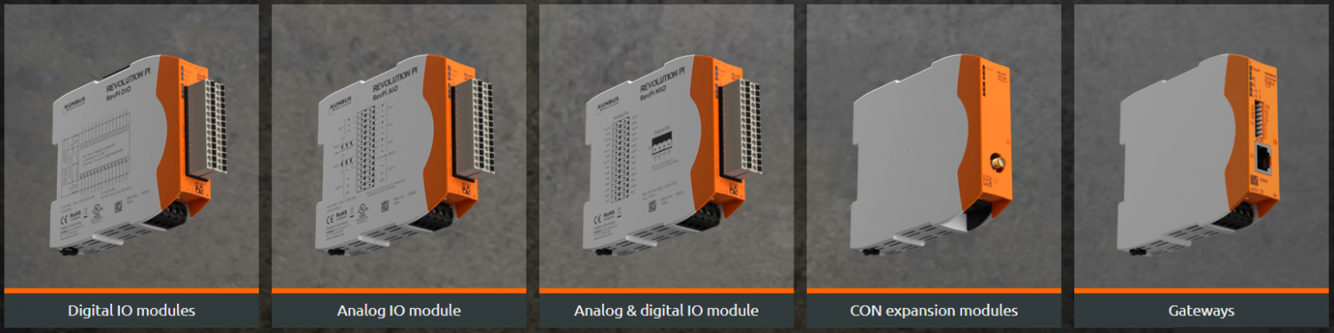 Revolution Pi är en öppen, modulär industri-PC baserad på den välkända Raspberry Pi. De tre basmodulerna, alla med kapslingar för DIN-skena, kan byggas ut med en mängd I/O-moduler och gateways. Modulerna konfigureras via ett grafiskt användargränssnittgränssnitt.