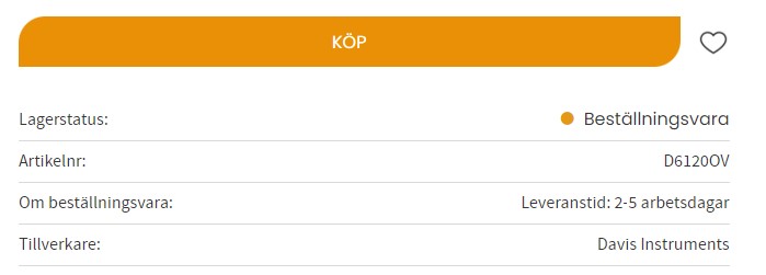 Är produkten en beställningsvara, markeras den med en gul prick och texten "Beställningsvara" samt normal leveranstid. Finns det fler varianter av en produkt, exempelvis olika kabellängd på en givare, ser du tillgängligheten när du valt önskad variant.