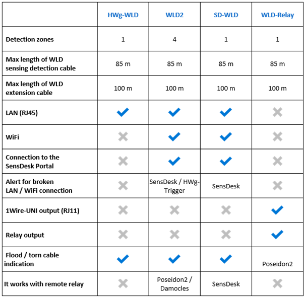 HW-group erbjuder flera enheter för att i tidigt skede få larm vid läckage från vattenledningar, glykol från kylsystem, kondens, avloppsvatten mm. En sensorkabel placeras på lägsta punkten i direkt närhet till anläggningen som ska övervakas. Upp till 85m sensorkabel kan anslutas och vid behov förlängas ytterligare med förlängningskabel.