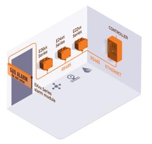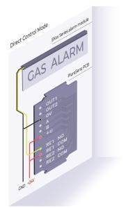 Direktstyrningsläge är det enklaste alternativet och gör att användare kan aktivera instrumentet för att indikera larm med hjälp av ett enkelt relä eller en brytare genom att bara slå på strömmen. Detta läge används oftast i miljöer där larmsituationer är kritiska och måste aktiveras omedelbart när en fara uppstår. Det är också möjligt att integrera EK3X- och EK6X-serierna med E26XX-seriens gasdetektorer genom att mata 24 VDC från ett relä som slår på LED-signalen.