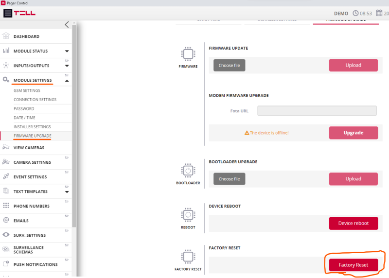 För att fabriksåterställa din Pager7 så väljer du Modem Settings --> Firmware upgrade --> Factory restore enligt bild nedan.