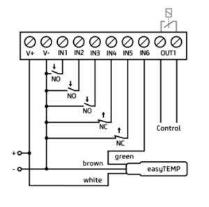 Anslutning av temperaturgivare görs till V+ och V- samt till önskad ingång: