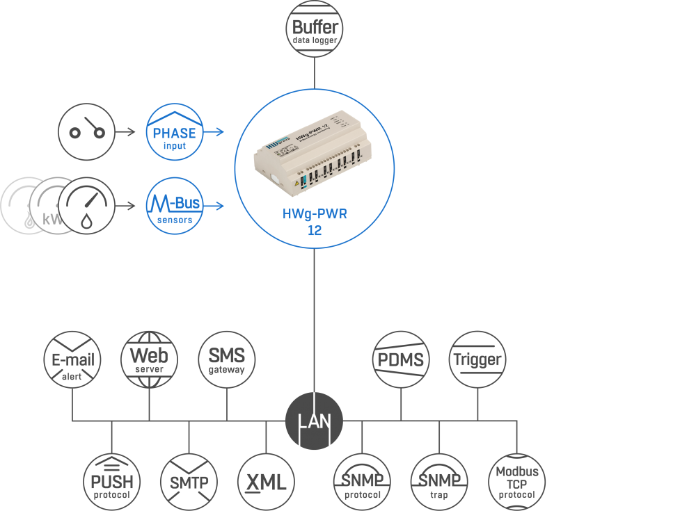 HWg-PWR-enheter är utformade för att övervaka externa M-Bus-mätare över nätverket med M2M-protokoll (Modbus TCP, SNMPv1, XML ...). Med stöd för över 50 SNMP- och SCADA-applikationer kan HWg-PWR-enheter användas som en fristående lösning eller integreras i ett stort övervaknings- och kontrollsystem.
