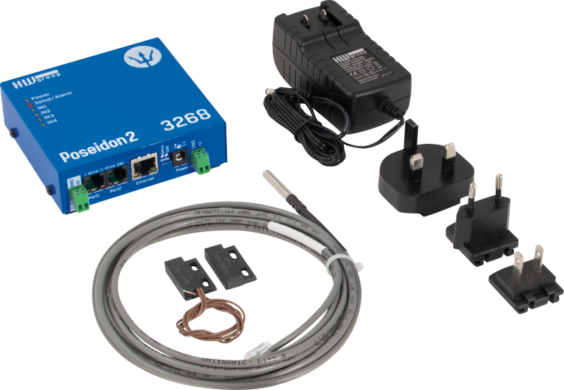 Enhet med tillbehör innehåller: Poseidon2 3268, en strömadapter, en temperaturgivare (3m kabel), dörrkontakt och en manual.