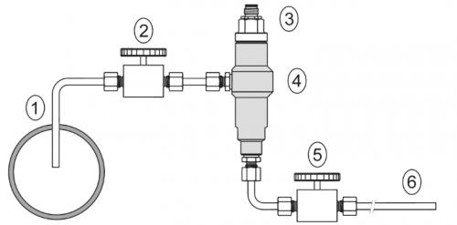 Utloppsrör (6) - om utloppet ska släppas ut i atmosfären bör utloppsröret vara min 1,5 m (rekommenderat för rör med diameter 6 mm). Detta för att undvika diffusion av omgivningsluft bakvägen som påverkar noggrannheten.