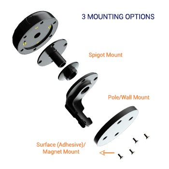 - Monteringsfäste: Ø20 gängade spigotar (anpassade för upp till 60 mm klämtjocklek) med självhäftande montering och magnetiskt alternativ