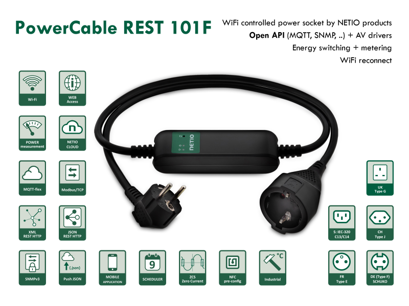 NETIO PowerCable REST 101F är en smart WiFi-styrd skarvsladd med ett uttag och mätning av elektriska parametrar. Den kan styras via webbgränssnitt, mobilapplikation, NETIO Cloud eller något av 10 tillgängliga Open API-protokoll.