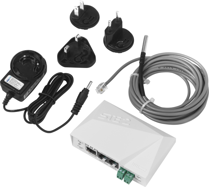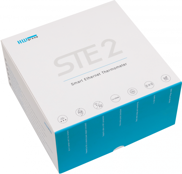 STE2 R2 är en enhet med SNMP-stöd avsedd för mätning av temperatur och luftfuktighet med externa givare och ansluts till nätverk via WiFi eller Ethernet (LAN). Om gränsvärden överskrids eller detektorer larmar så kan enheten skicka larm via e-post, via Sensdesk eller via SMS (via HWg-SMS-GW3 gateway i samma nätverk).