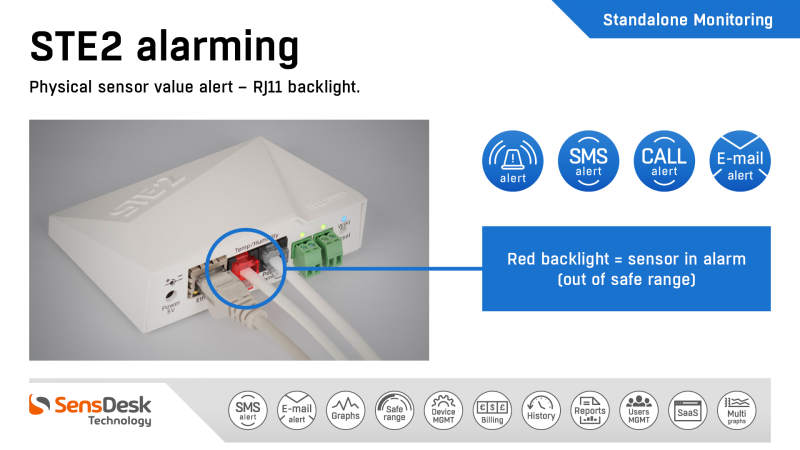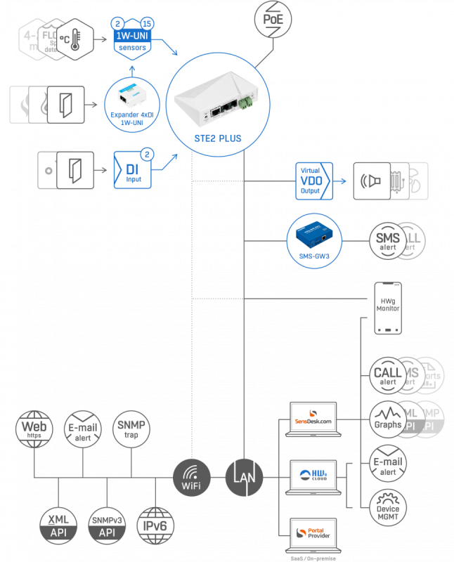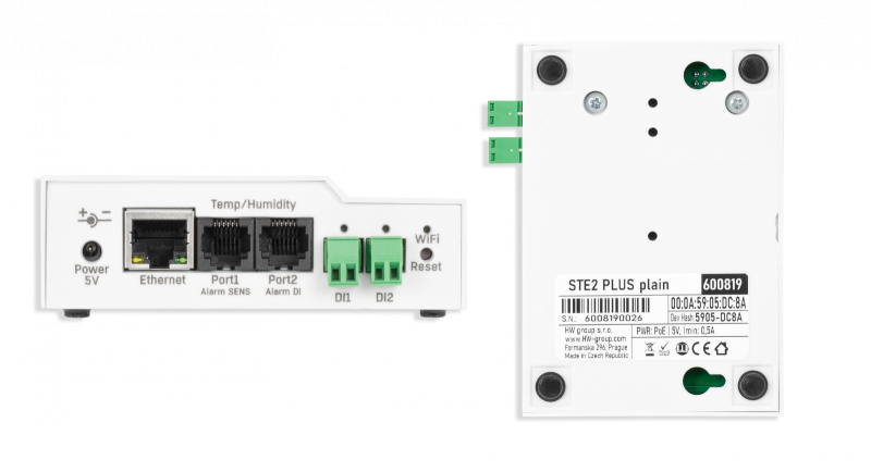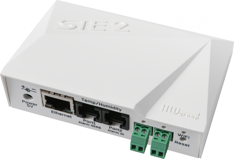 STE2 PLUS är en professionell produkt för fjärrövervakning av sensorer via LAN och WiFi. Du kan ansluta externa sensorer (upp till 15 värden) till 2x RJ11-portar. Externa detektorer kan anslutas till 2x DI (Digital Input). STE2 PLUS är en professionell enhet med stöd för HTTPS-anpassade certifikat, SNMPv3, SNMP Traps och IPv6.