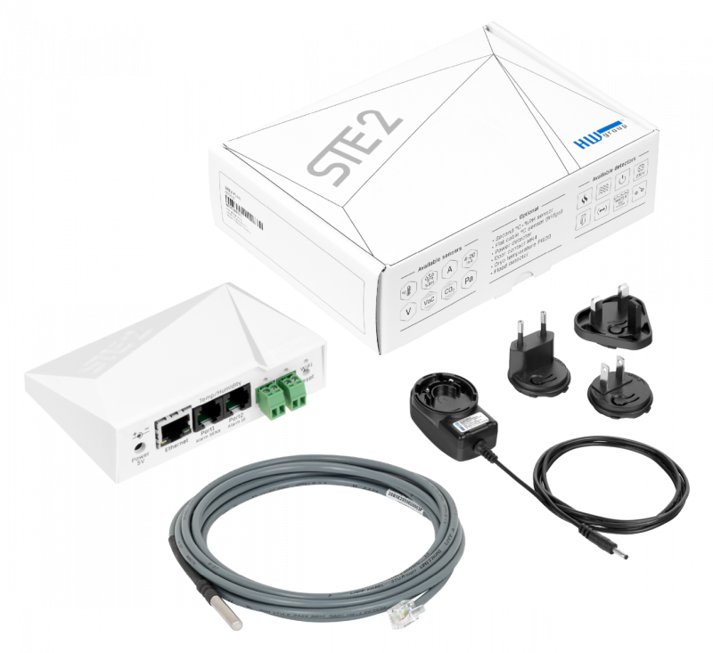 - Enhet med tillbehör innehåller: STE2 PLUS, Temperatursensor 3m (IP67) + US/UK/EU strömadapter ingår.