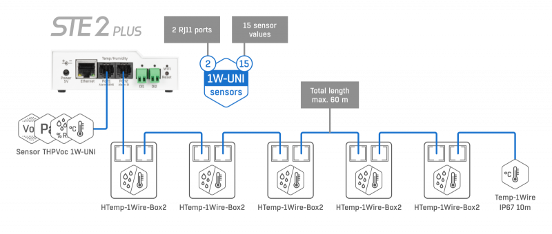 - 2x RJ11-port (1W-UNI) för upp till 15 sensorvärden totalt