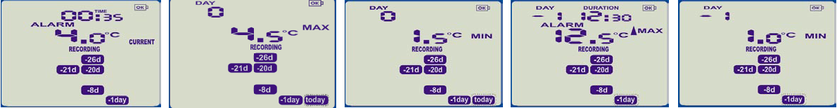 Displayen är utformad för att ge en överblick av temperaturöverträdelser som har inträffat för både den aktuella avläsningen och upp till de senaste 30 dagarna.